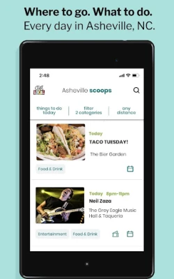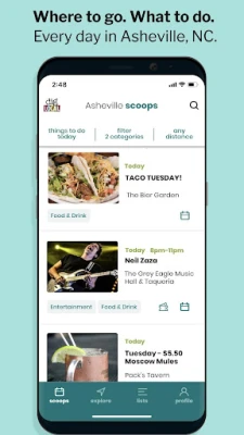 Asheville’s authentic places and happenings are found in the SCOOPS tab where you’ll not only find events and deals but also helpful info like who’s having Taco Tuesday, pint night or live music.