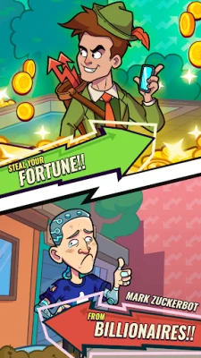 Meet your modern Robin Hood, he will guide you through this idle clicker game and teach you how to steal cash from the big companies and their greedy CEOs!